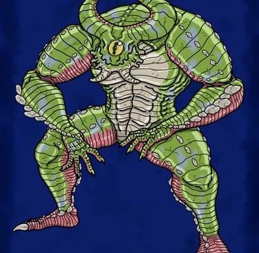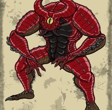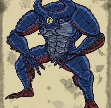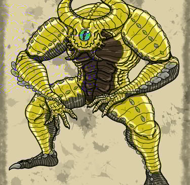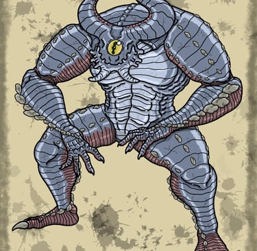 Titan mesurant entre 3 et 4 mètres de haut. Son corps est recouvert d'une peau métallique ultrarésistant dû à son adaptation aux milieux hostiles et rocailleux ainsi qu'aux minéraux dont il se nourrit. Les cicatrices sur son corps témoignent des nombreux conflits entre lui et ses semblables ainsi qu'avec d'autres créatures dangereuses qui peuple la région. Possédant un tempérament très agressif envers toutes créatures entrant sur son territoire, il vit de ce fait en solitaire. Ce qui rend la reproduction de l'espèce très compliquée, du fait que les rapports d'accouplements sont très brutaux, voir mortels pour la femelle qui ne mesure qu'entre 2,50 et 3 mètres de haut. De même, quand elles mettent au monde leur portée d'un seul petit tous les deux ans, elles les abandonnent, les obligeant à se débrouiller seul pour survivre et favorisant leurs caractères agressifs envers ses pareils. Possédant une vue et une ouïe très développée, il est très sensible aux explosions lumineuses et sonores, dont les chasseurs se servent pour l'affronter. Il est classé parmi les monstres supérieurs, notamment à cause de sa force colossale. Seuls les aventuriers les plus expérimentés peuvent oser les défier. Leur peau étant de grande qualité d'un point de vue défense, elle peut servir de matériau d'armure de grande valeur, particulièrement par leur résistance et leur souplesse de mouvement. Leur unique pupille, de grande valeur, elle aussi, est constituée de cristaux similaires à ceux d'une pierre précieuse. Elle peut être vendue à très bon prix sur le marché ou servir de pierre mystique comme les yeux de certains dragons par exemple.