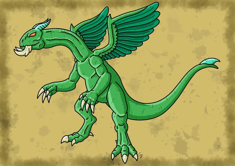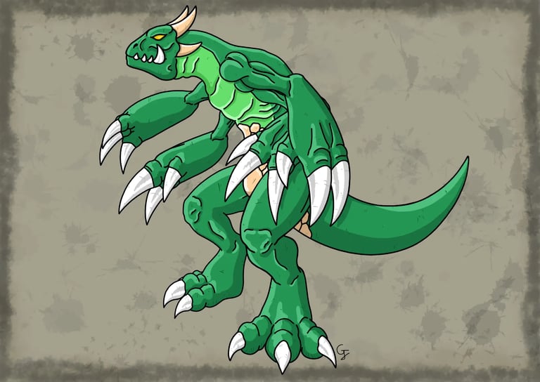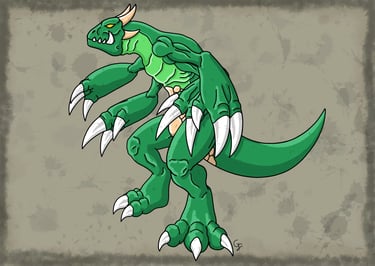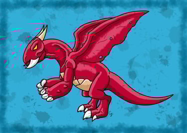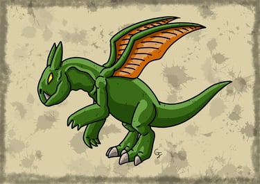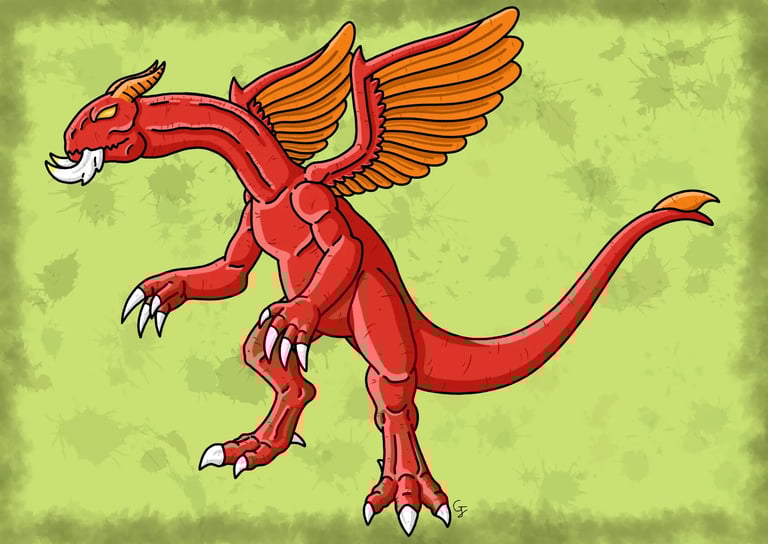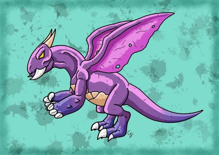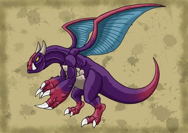 Une des nombreuses espèces de dragons à crocs mesurant 4 mètres et possédant un cuir épais et résistant de couleur pourpre. Ses deux crocs proéminents sont dirigés vers l'avant, semblables à des mandibules d'insectes dont il se sert lors de charges ou de morsures. Il possède également de longues et épaisses griffes qui sont assez puissantes pour entailler la roche. Bipède, il est capable de donner des coups de griffes, mais également des coups de poings enflammés. Comme une grande partie des dragons, il est capable de cracher du feu. Ses ailes, bien qu'elles soient un peu courtes et qu'elles aient souvent leur membrane percée de trous, sont assez puissantes pour lui permettre de se soulever et de voler dans les airs. C'est une créature solitaire qui est d'un tempérament assez querelleur, surtout envers ses semblables, mais est aussi capable de faire preuve de sociabilité avec d'autres créatures. C'est une créature assez répandue que l'on peut trouver dans divers environnements dans la nature.