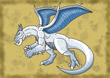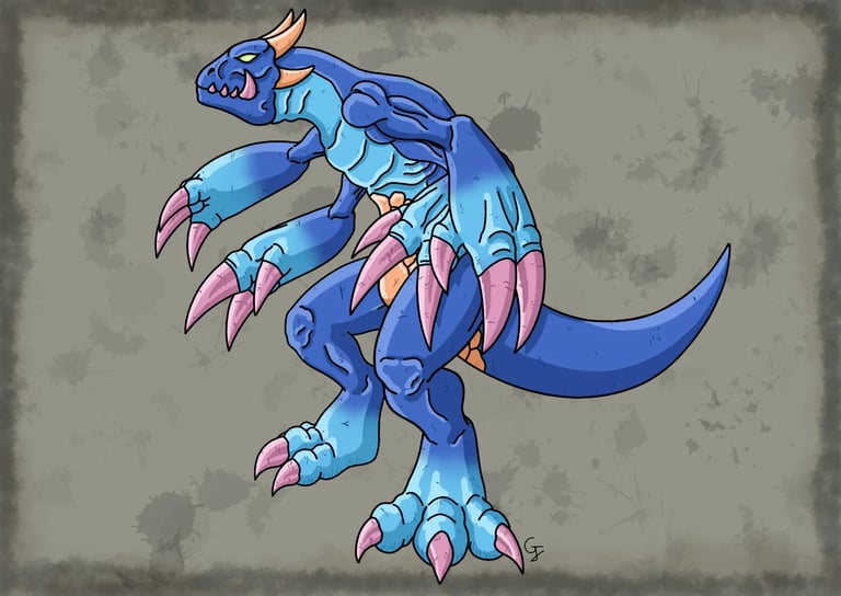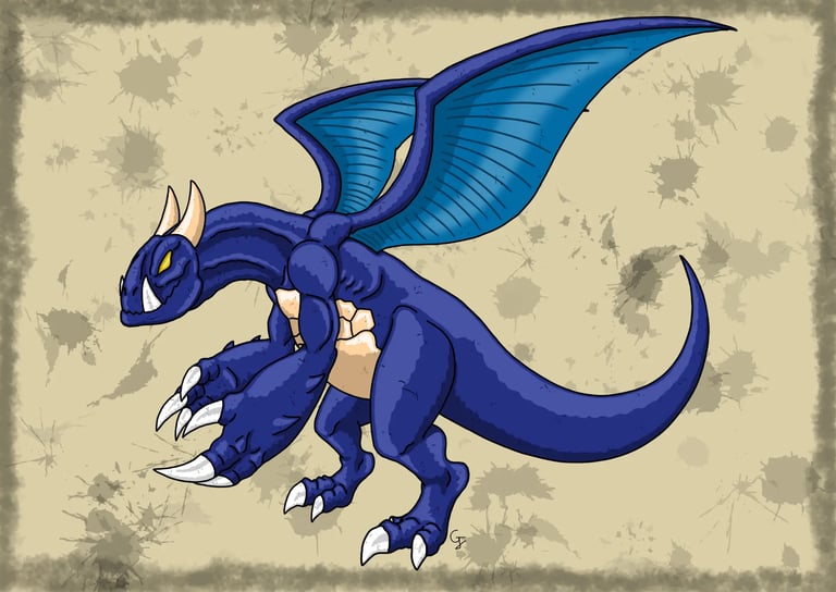 Une des nombreuses espèces de dragons à crocs qui est dotée d'une peau épaisse et résistante de couleur bleu marine. Ce spécimen possède une paire de crocs tournée vers le haut et légèrement en arrière. C'est un dragon bipède qui possède aux pattes avant des avant-bras très épais dont les doigts sont terminés par de puissantes griffes blanches acérées qui peuvent aisément lacérer ses adversaires et même entailler la roche. Il peut également donner de puissants coups de queue avec sa queue épaisse et puissante pour se défendre. Comme la plupart des dragons, il maîtrise le souffle, crachant de grosses boules de flammes pour rôtir ses ennemis. Ce spécimen est doté d'ailes un peu courtes, mais puissantes qui lui permettent de voler, d'observer son territoire et de repérer ses proies depuis les airs. Long de 6 m, c'est une créature solitaire et intelligente qui peut faire preuve d'agressivité comme de sagesse en fonction des individus ou des créatures à qui il a affaire. C'est une créature que l'on peut trouver dans divers milieux de la nature.