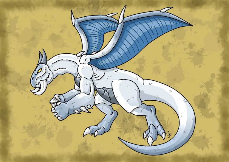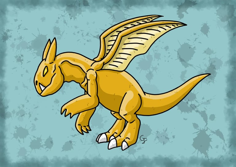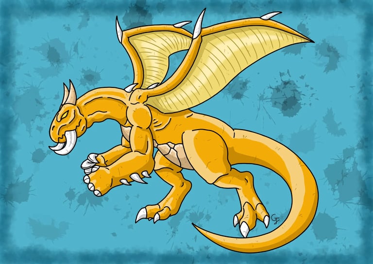 Une des espèces de dragons à crocs qui mesure entre 8 et 9 mètres de long et qui possède une peau très épaisse et résistante de couleur citrine. Appartenant aux espèces parmi les plus grandes des dragons à crocs, il est craint est respecté des autres créatures pour sa force qui fait partie des plus puissantes parmi les espèces communes. Malgré sa force et son aspect intimidant, il est en réalité doté d'une grande sagesse, n'utilisant sa force que si cela est nécessaire. Il s'entend très bien avec les autres créatures qui peuple son environnement. Bipède et doté de grandes pattes épaisses et puissantes, il se sert de ses pattes avant doté de puissantes griffes plus pour frapper à coups de poings qu'à coups de griffes. Il peut même les recouvrir de flammes pour augmenter sa force de frappe. Sa mâchoire possède des crocs proéminents en forme de défenses dont il se sert pour lancer de lourdes charges. Il est également doté d'une longue et puissante queue qu'il utilise pour balayer ses adversaires. Bien sur, il aussi capable de lancer des attaques de feu comme, de grosses boules de feu, un puissant souffle ardent et est même capable de faire pleuvoir une pluie de flammes. C'est une créature assez rare que l'on peut croiser dans des milieux assez variés.