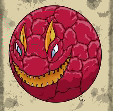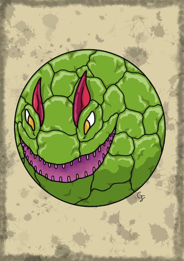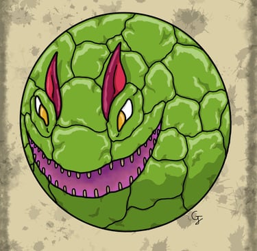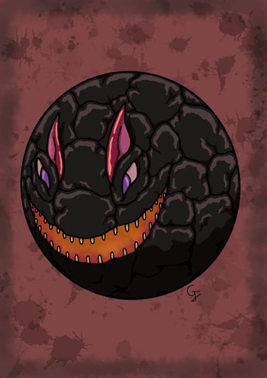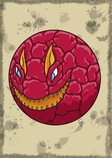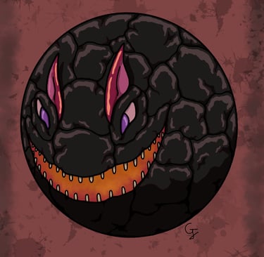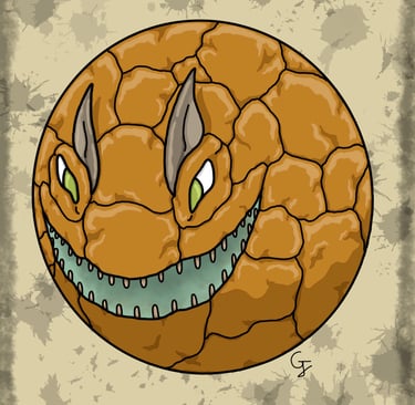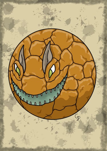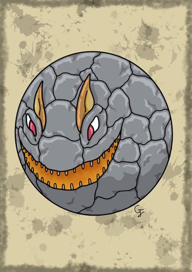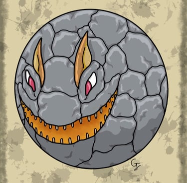 Monstre constitué de roche organique, déployant un large sourire pas très rassurant et munis de deux cornes au-dessus des yeux. Ce monstre de 1,50 m de diamètre reste la plupart du temps stoïque, le regard figé à observer ce qui se passe. Quand il croise une autre créature, il veut absolument jouer avec elle, expriment sa joie de son sourire déstabilisant. S'il vous voit et qu'il veut jouer avec vous, fuyez le plus vite possible ou vous finirez broyer par ses jeux de roulade et écrasement, son sourire étant la dernière chose que vous verrez. C'est un monstre solitaire que l'on peut croiser en montagne ou dans une vallée, sur les chemins escarpés, là où il est sûr de pouvoir se trouver des amis temporaires.