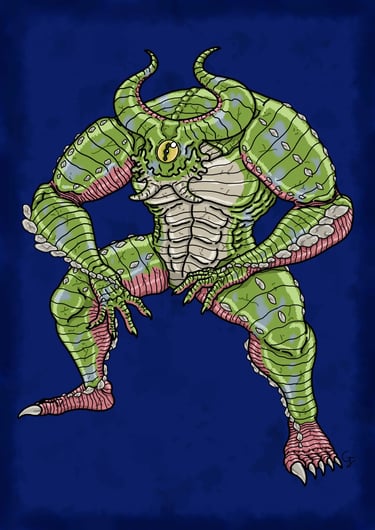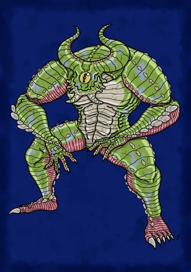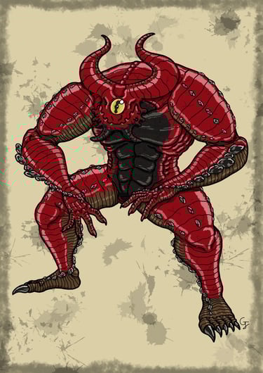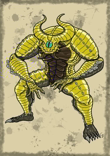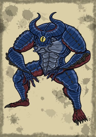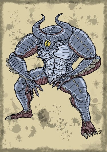 Titan mesurant entre 3 et 4 mètres de haut. Son corps est recouvert d'une peau métallique ultrarésistant dû à son adaptation aux milieux hostiles et rocailleux ainsi qu'aux minéraux dont il se nourrit. Les cicatrices sur son corps témoignent des nombreux conflits entre lui et ses semblables ainsi qu'avec d'autres créatures dangereuses qui peuple la région. Possédant un tempérament très agressif envers toutes créatures entrant sur son territoire, il vit de ce fait en solitaire. Ce qui rend la reproduction de l'espèce très compliquée, du fait que les rapports d'accouplements sont très brutaux, voir mortels pour la femelle qui ne mesure qu'entre 2,50 et 3 mètres de haut. De même, quand elles mettent au monde leur portée d'un seul petit tous les deux ans, elles les abandonnent, les obligeant à se débrouiller seul pour survivre et favorisant leurs caractères agressifs envers ses pareils. Possédant une vue et une ouïe très développée, il est très sensible aux explosions lumineuses et sonores, dont les chasseurs se servent pour l'affronter. Il est classé parmi les monstres supérieurs, notamment à cause de sa force colossale. Seuls les aventuriers les plus expérimentés peuvent oser les défier. Leur peau étant de grande qualité d'un point de vue défense, elle peut servir de matériau d'armure de grande valeur, particulièrement par leur résistance et leur souplesse de mouvement. Leur unique pupille, de grande valeur, elle aussi, est constituée de cristaux similaires à ceux d'une pierre précieuse. Elle peut être vendue à très bon prix sur le marché ou servir de pierre mystique comme les yeux de certains dragons par exemple.