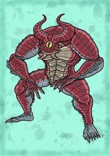 Titan mesurant entre 3 et 4 mètres de haut. Son corps est recouvert d'une peau métallique ultrarésistante due à son adaptation aux milieux hostiles et rocailleux ainsi qu'aux minéraux dont il se nourrit. Les cicatrices sur son corps témoignent des nombreux conflits entre lui et ses semblables ainsi qu'avec d'autres créatures dangereuses qui peuplent la région. Possédant un tempérament très agressif envers toutes créatures entrant sur son territoire, il vit de ce fait en solitaire. Ce qui rend la reproduction de l'espèce très compliquée, du fait que les rapports d'accouplements sont très brutaux, voire mortels pour la femelle qui ne mesure qu'entre 2,50 et 3 mètres de haut. De même, quand elles mettent au monde leur portée d'un seul petit tous les deux ans, elles les abandonnent, les obligeant à se débrouiller seuls pour survivre et favorisant leurs caractères agressifs envers ses pareils. Possédant une vue et une ouïe très développées, il est très sensible aux explosions lumineuses et sonores, dont les chasseurs se servent pour l'affronter. Il est classé parmi les monstres supérieurs, notamment à cause de sa force colossale. Seuls les aventuriers les plus expérimentés peuvent oser les défier. Leur peau étant de grande qualité d'un point de vue défense, elle peut servir de matériau d'armure de grande valeur, particulièrement par leur résistance et leur souplesse de mouvement. Leur unique pupille, de grande valeur, elle aussi, est constituée de cristaux similaires à ceux d'une pierre précieuse. Elle peut être vendue à très bon prix sur le marché ou servir de pierre mystique comme les yeux de certains dragons par exemple.