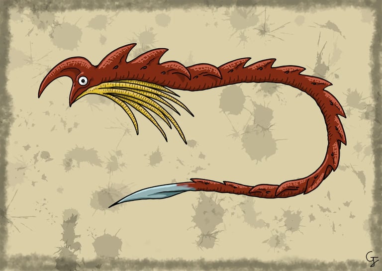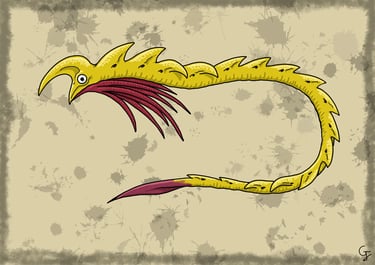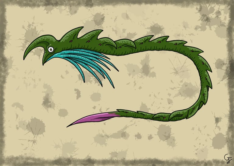 Créature archaïque pratiquement légendaire et extrêmement rare qui est réputée être annonciatrice de cataclysmes ou de désastres. Long de 6 m, il possède un long corps jaune chevauché de crêtes avec à l'avant du corps une tête en forme de celle d'un coq et à l'autre bout terminé par un dard de couleur pourpre. Il possède également, au niveau de sa gorge, une sorte de regroupement de tiges organiques ressemblant à un plumeau qui contient de puissants pouvoirs. En effet, cette créature est capable de provoquer un puissant orage assourdissant ou bien un violent incendie qui peuvent ravager tout sur leur passage s'il est en colère. Il est également capable de créer des chaines de foudre ou de feu partout autour de lui, le rendant impossible à approcher. C'est une créature de très haut rang à ne clairement pas sous-estimer malgré les apparences. Le seul moyen de le neutraliser est de lui couper ses tiges, encore est-il capable de les atteindre sans subir une blessure mortelle à l'aide de sa queue harpon affutée comme une lame de scalpels qui carbonise sur place au contact. Cette créature est généralement aperçue dans les milieux rocheux et escarpé en altitude, comme les terrains montagneux, lévitant dans les airs tels certains dragons. Il est aussi possible de l'apaiser en lui faisant une offrande afin d'éviter son courroux. Il fait partie du trio de créatures annonciatrices de désastres avec le Reptydracrête et le Terrairacrête et sont des créatures dotées d'une grande intelligence qui peuvent comprendre les paroles humaines.